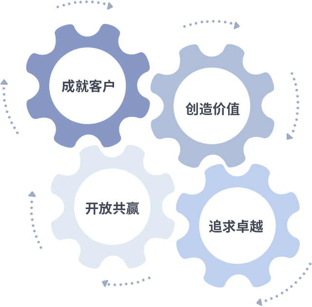 成就客户是一切决策的出发点,,,,创造价值是衡量所有工作的标准,,,追求卓越是我们做事做人的态度,,,,开放共赢是我们的格局也是最终的结果。。价值观的齿轮环环相扣,,,推动着组织里的每个人不断向前。。。